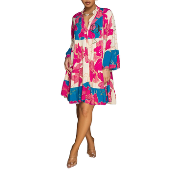 OEM女性用Boho花柄プリント長袖ミニドレスボタンスタンドアップカラーフレアスリーブルーズサマードレス