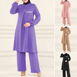 デザイナー女性控えめなイスラム教徒の衣装カジュアルOネック長袖シャツワイドレッグパンツ2ピースコットン通気性アバヤセット